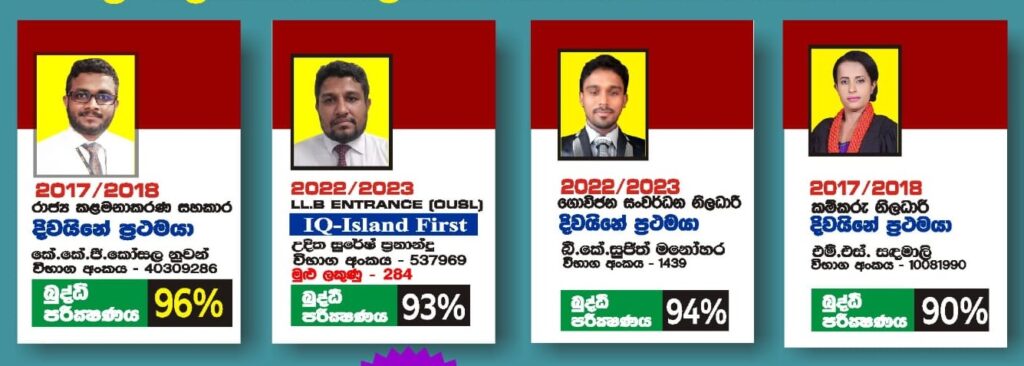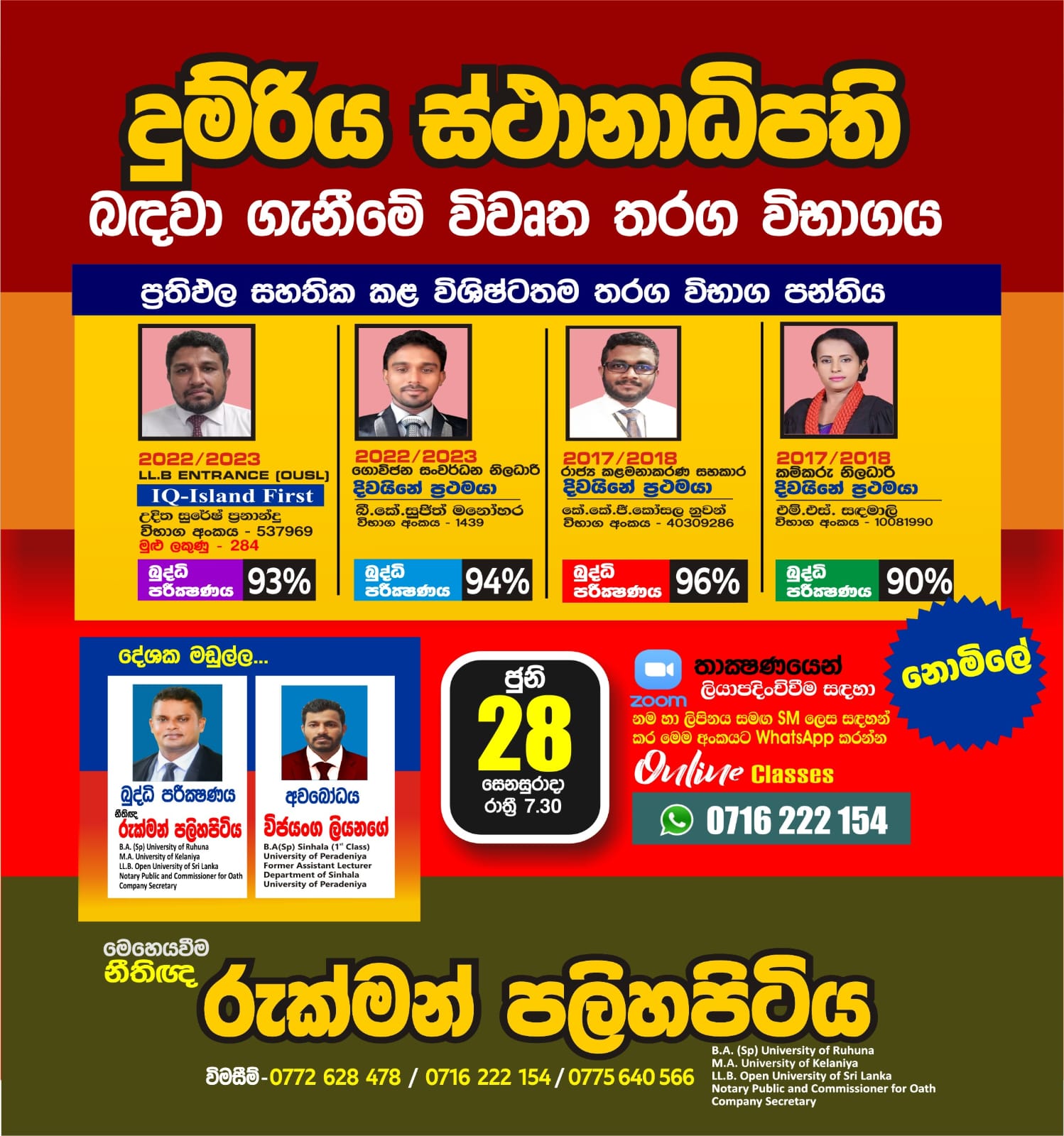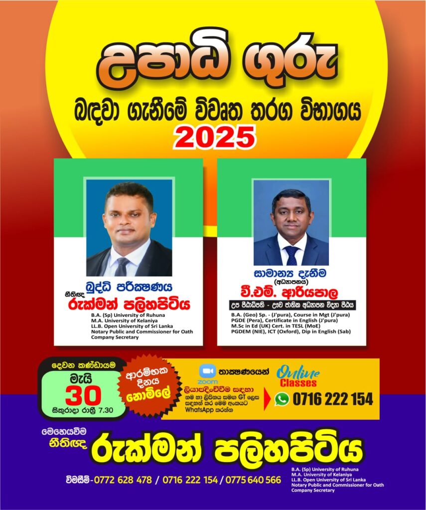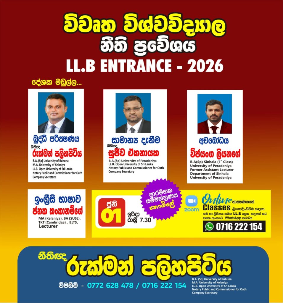 B.A. (Sp) University of Ruhuna M.A. University of Kelaniya LL.B. Open University of Sri Lanka Notary Public and Commissioner for Oath Company Secretary